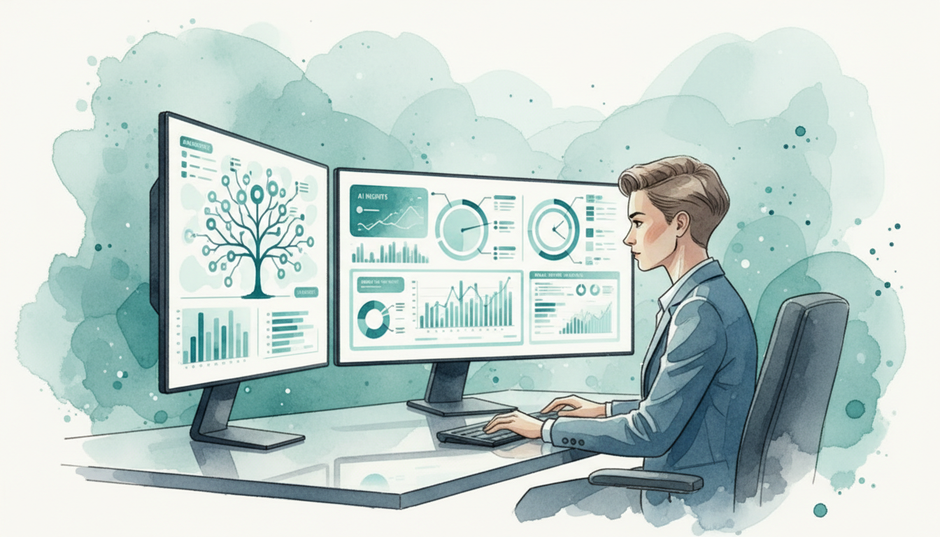 描述:16:9 宽屏比例,水彩插画风格。画面展示一个现代化的数据分析工作空间:大屏幕上显示着 colorful 的数据可视化图表(折线图、饼图、热力图),周围有漂浮的数据点和 AI 元素(神经网络图案、ChatGPT logo、Python logo)。一位专业人士正在用平板电脑与数据互动。色调以蓝色、紫色和橙色为主,传达科技感、专业性和创造力。背景有柔和的水彩晕染效果。